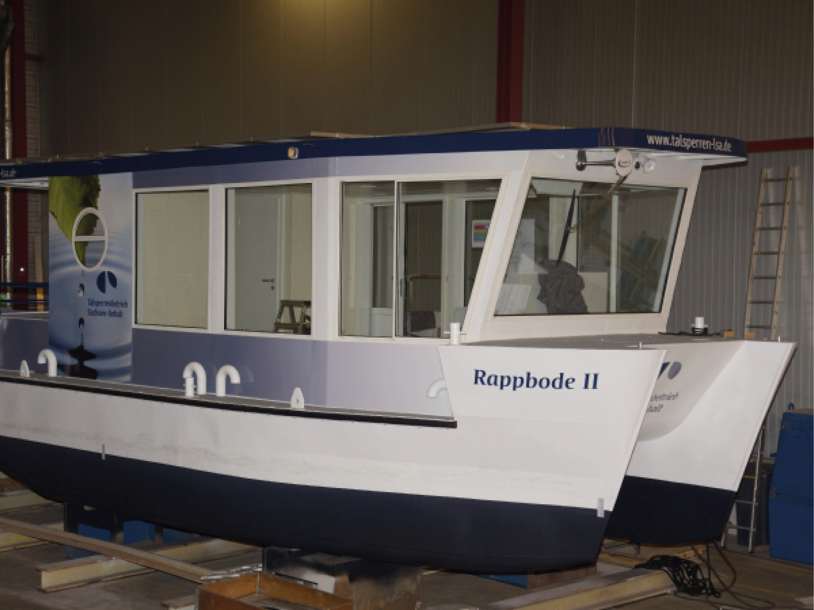 Auch der Katamaran für Wassergütekontrolle wurde nach Zeichnungen der Stralsunder Werft von mir farblich und mit Großformatfotografie gestaltet.