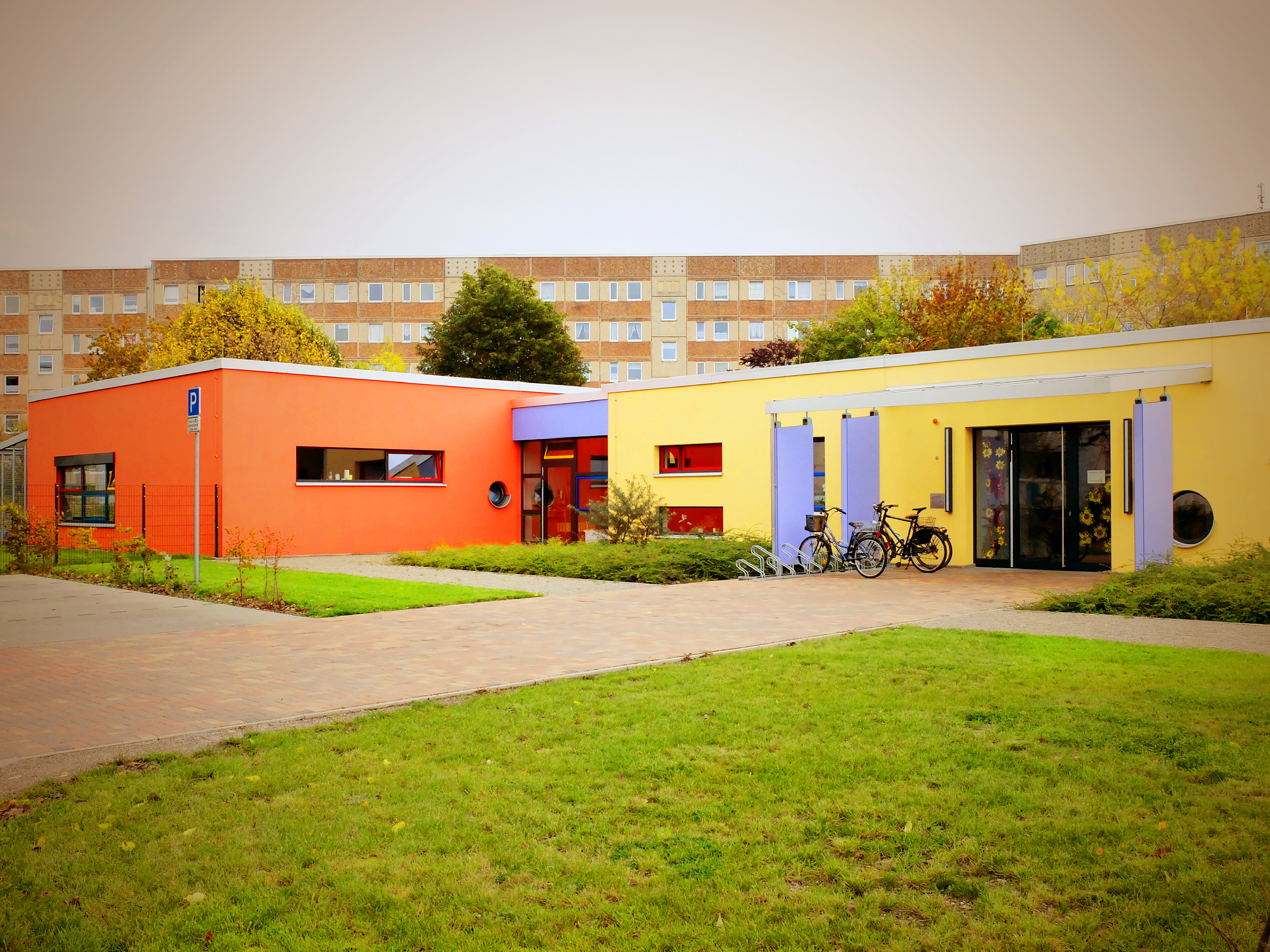 In den Räumen der Kita Musikus wurde in Form der farblichen Wandgestaltung fortgesetzt, was die Architekten bei Auswahl der Materialien schon begonnen hatten: großflächige Farbsignale, die den Weg zu den Kitabereichen weisen, ausgeschmückt mit Grafiken der Musikinstrumente, die von den Kinder benutzt werden. Eine Übersicht der Räume im Eingangsbereich unterstützt die Orientierung zusätzlich.