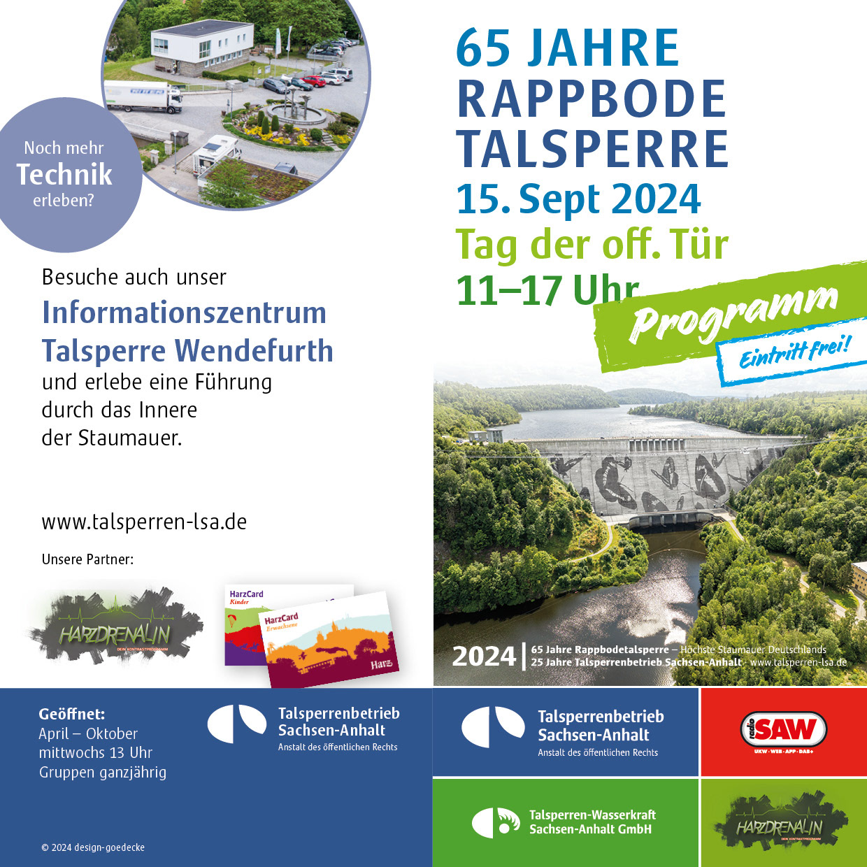 Für eine entspanntete Anreise zum Tag der offenen Tür an der Rappbodetalsperre, am 15. September 2024, gibt´s hier für Interessierte hier das Progamm mit Anfahrtsbeschreibung.