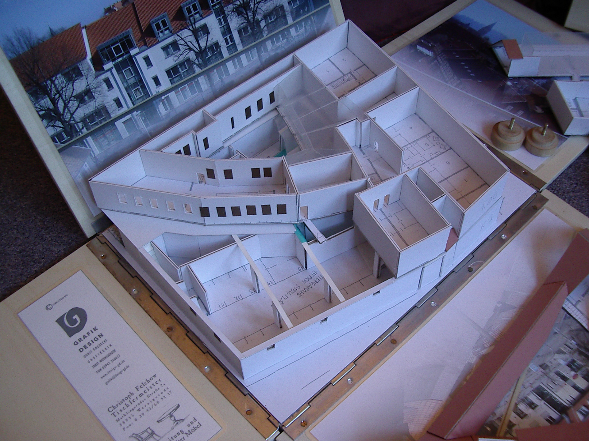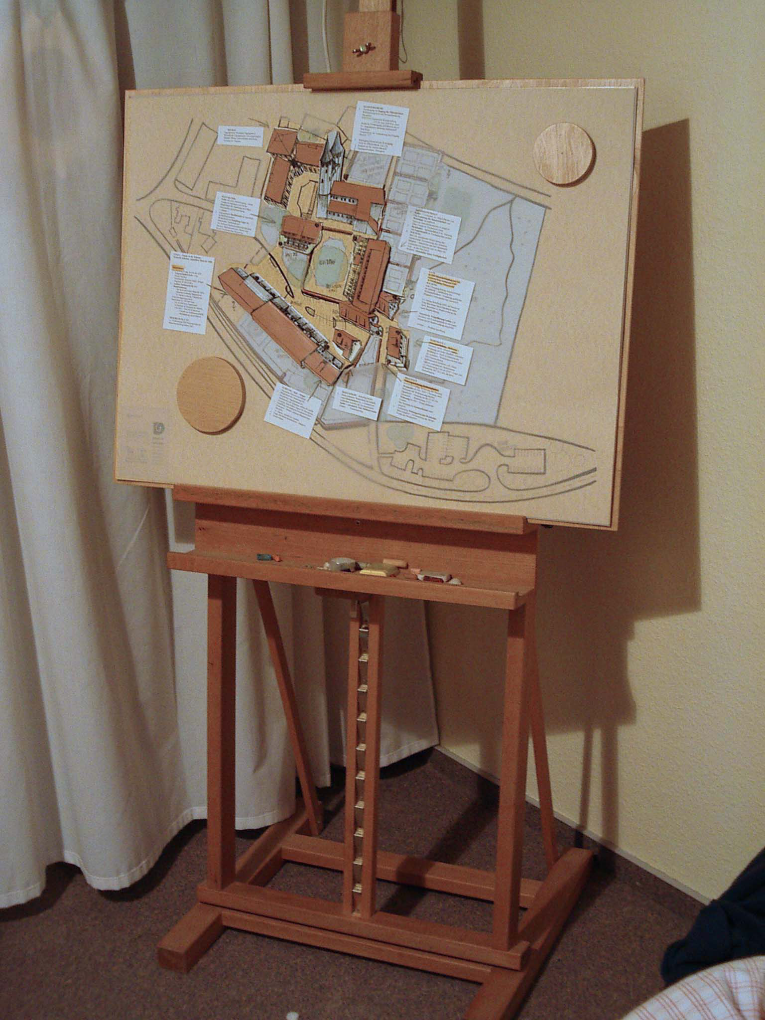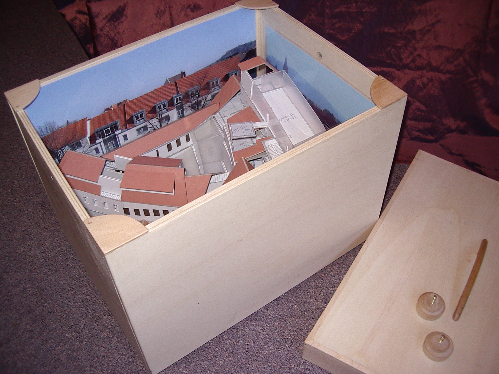 Zur besseren Planung der Bauvorhaben wurde dieses Modell bei mir in Auftrag gegeben. Die einzenlnen Häuser lassen scih aufklapen. Es werden die Ebenen sichtbar. Über ein Transparentpapier können Skizzen und Notizen angebracht werden. Alle Gebaude und Gärten wurden von mir nach Plänen handskizziert.